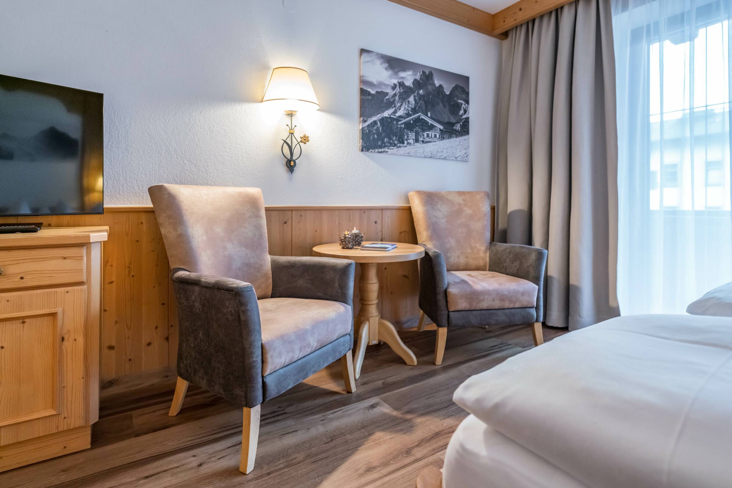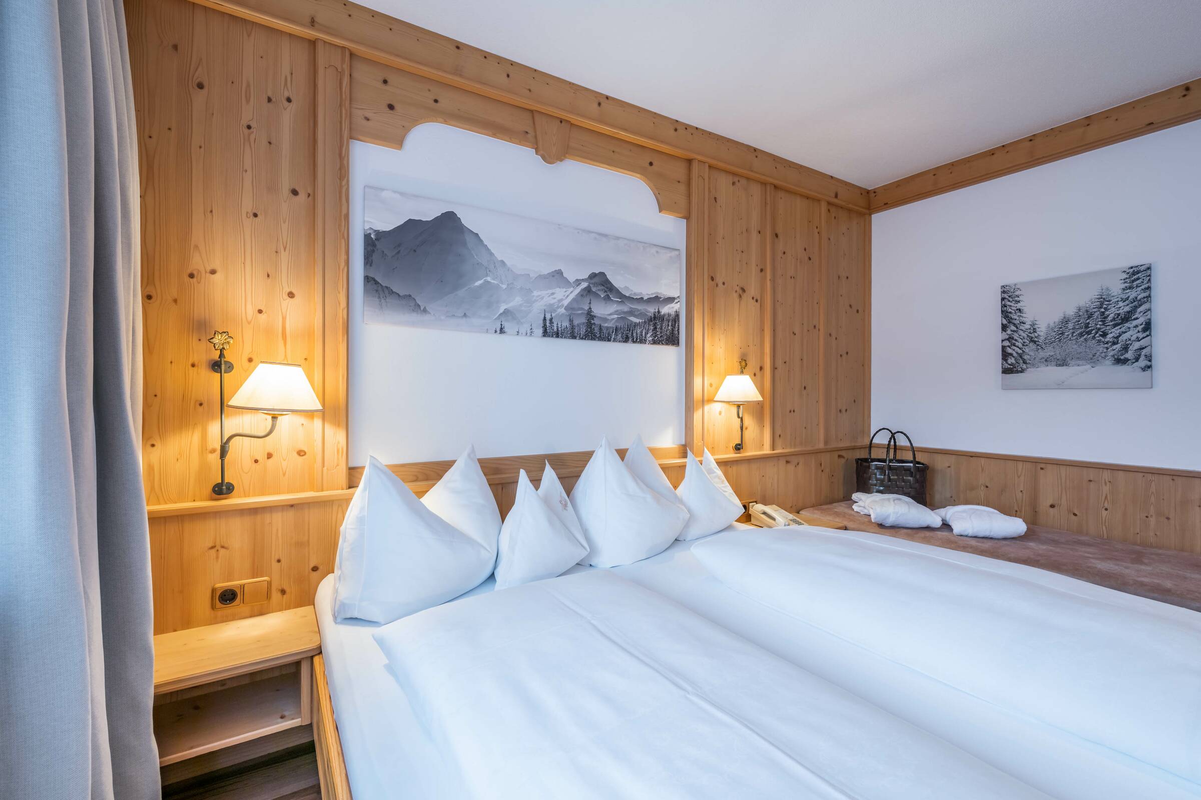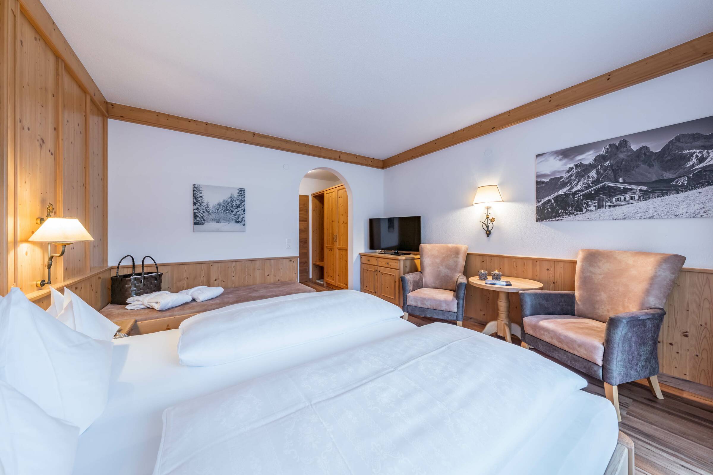 Sie wohnen in einem gemütlichen Zimmer mit Doppelbett und einem Einzelbett, Badezimmer mit Dusche und WC, Haarfön, Safe, Telefon, Flat-TV via Kabel, Teppichboden und Balkon (teilweise französischer Balkon).